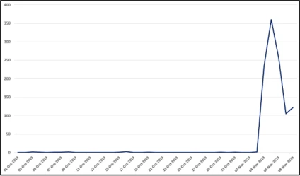 Op 5 november werden 360 van dergelijke domeinen geregistreerd; tot één dag daarvoor was het hoogste dagelijkse aantal registraties in 2023 vijf. Zelfs het ogenschijnlijke einde van de ‘piek’ na 6 november kan een artefact zijn dat wordt veroorzaakt door het feit dat er soms een vertraging van enkele dagen zit tussen de registratie van domeinen en hun opname in het bijbehorende zonebestand, waardoor sommige recente registraties mogelijk niet in de analyse zijn meegenomen.